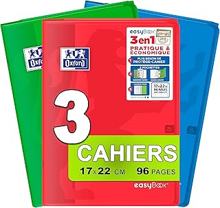 OXFORD EasyBook Lot de 3 Cahiers Agrafés Petits Formats 17 x 22cm 96 Pages Grands Carreaux Seyès 90gr Couleurs Assorties