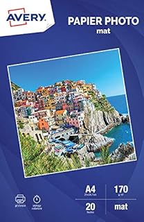 AVERY - 20 feuilles de papier photo 170g/m² mat, Format A4, Impression jet d'encre,