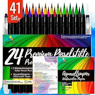 Set feutres pinceaux HAUTE QUALITÉ I 24 Brush Pens pour calligraphie à la main I 2 pinceaux réservoir eau I 15 feuilles Aquarelle I set crayons Aquarelle pour scrapbooking et bullet journal